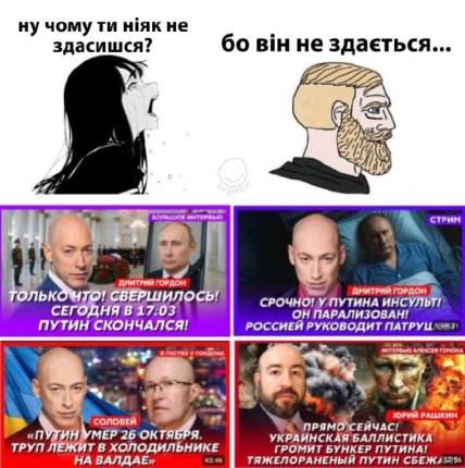 На зображенні — класичне протиставлення емоцій і стійкості. Зліва — плачуча жінка з підписом: "Чому ти ніяк не здасися?", що уособлює розпач тих, хто вже втомився чекати підтвердження чергових "сенсацій" про смерть очільника Кремля. Праворуч — "Гігачад" (персонаж-мем, що символізує ідеального, сильного, невразливого чоловіка) із підписом: "Бо він не здається…".