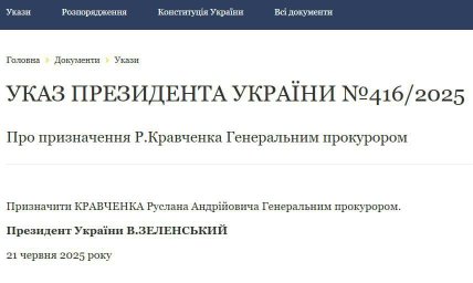 Про це свідчить інформація на сайті Офісу президента. Відомо, що указ № 416/2025 було підписано у суботу, 21 червня.