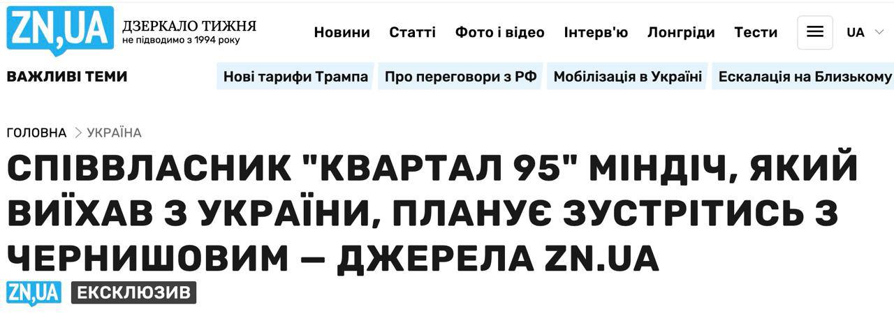 Варто зазначити, що джерела ZN.UA повідомляють, що близький до ОПУ бізнесмен і співвласник студії "Квартал 95" Тімур Міндіч, який 20 червня виїхав з України, планує провести зустріч із Чернишовим.