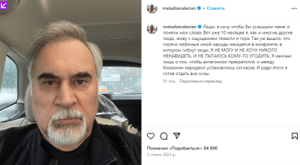 Свою позицію артист вирішив не пояснювати — він просто виправдався. Меладзе у дописі зазначив, що "його гаряче улюблені народи перебувають у конфлікті". Валерій написав, що не хоче когось ненавидіти, а мріє, щоб припинився антагонізм. Після цього співак більше не висловлювався про війну, яку веде Росія на території України.