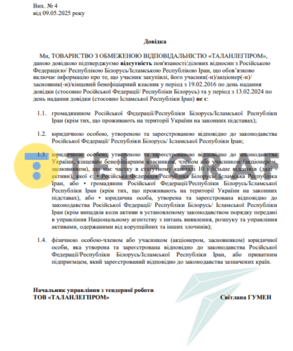 Разом з тим, варто зазначити, що в тендерній документації, яку подавала компанія "Таланпром" є довідка про відсутність зв’язків з РФ, отримана 9 травня 2025 року, в якій вказується, що компанія підтвердила відсутність юридичних чи ділових відносин не лише з Росією, а й з Республікою Білорусь та Іраном.
