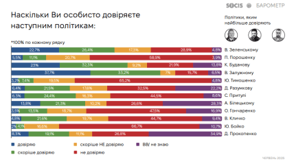 Найвищий рівень довіри серед українських політиків у червні 2025 року мають Валерій Залужний, Кирило Буданов і Володимир Зеленський. Згідно з даними, 33,2% опитаних повністю довіряють Залужному, ще 33,2% — скоріше довіряють. Таким чином, він очолює рейтинг із сумарним показником довіри у 66,4%. При цьому лише 7% респондентів зазначили, що "скоріше не довіряють" йому, 15,7% — "не довіряють", а 6,5% не змогли відповісти.