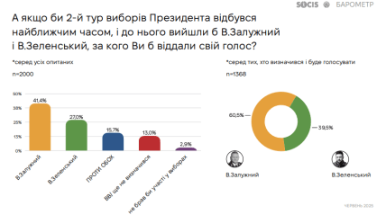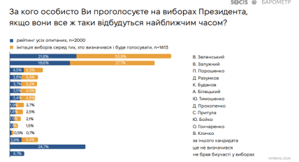 Більшість українців вважають, що після завершення воєнного стану потрібно проводити вибори, і в разі голосування на президентських виборах найбільше підтримали б Валерія Залужного. Про це свідчать результати загальнонаціонального опитування, проведеного Центром SOCIS у червні 2025 року. Дослідження охопило 2000 респондентів з усіх регіонів (крім тимчасово окупованих територій), опитування проводилося методом face-to-face, вибірка репрезентативна за статтю, віком, типом населеного пункту та регіоном. Похибка не перевищує 2,1%.
