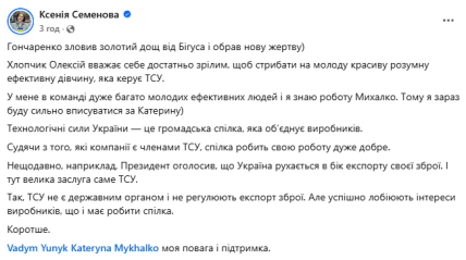 "Хлопчик Олексій вважає себе достатньо зрілим, щоб стрибати на молоду красиву розумну ефективну дівчину, яка керує ТСУ. У мене в команді дуже багато молодих ефективних людей і я знаю роботу Михалко. Тому я зараз буду сильно вписуватися за Катерину). Технологічні сили України — це громадська спілка, яка обʼєднує виробників. Судячи з того, які компанії є членами ТСУ, спілка робить свою роботу дуже добре. Нещодавно, наприклад, Президент оголосив, що Україна рухається в бік експорту своєї зброї. І тут велика заслуга саме ТСУ. Так, ТСУ не є державним органом і не регулюють експорт зброї. Але успішно лобіюють інтереси виробників, що і має робити спілка", — написала Семенова.