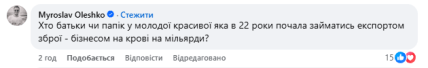 "Я бачив багато людей у своєму житті, але, на жаль, жодного 24-річного не зустрічав, хто міг би очолити експорт зброї. Наприклад, у 2021 році ми продали зброї на 145 мільйонів доларів. Тобто зараз — ще більше. Може, я чогось не розумію? Може, пані Катерина з семирічного віку вже в цій сфері й має такі зв’язки, які нам і не снилися? Просто цікаво. Може, до цього вона вже керувала системами чи компаніями з подібними бюджетами? Я просто не можу зрозуміти логіку призначення. Красива — так. Фотосети — бачу. А де професійність? Які досягнення?" — запитав депутат.