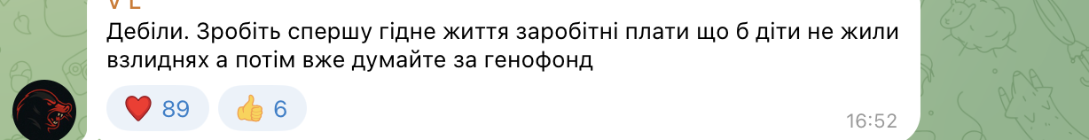 Були серед українців і ті, хто підтримали таку ініціативу, але здебільшого це релігійні люди. Однак багато користувачів наголошували на тому, що держава має робити усе, щоб батьківство було легшим і приємним, а не тягарем та випробуванням, тоді, мовляв, народжуваність зросте.