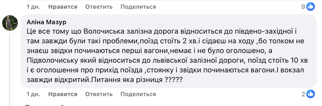 "Пасажири змушені чекати нічні потяги біля не працюючих вокзалів. Жінка змушена робити пересадку у Волочиську і чотири години в ночі чекати свій потяг у темряві, на самоті, де нема ні чергових, ні працівника поліції, жодного прихистку на час очікування. Залізничний вокзал станції Волочиськ — це суцільний жах", — йдеться у повідомленні.