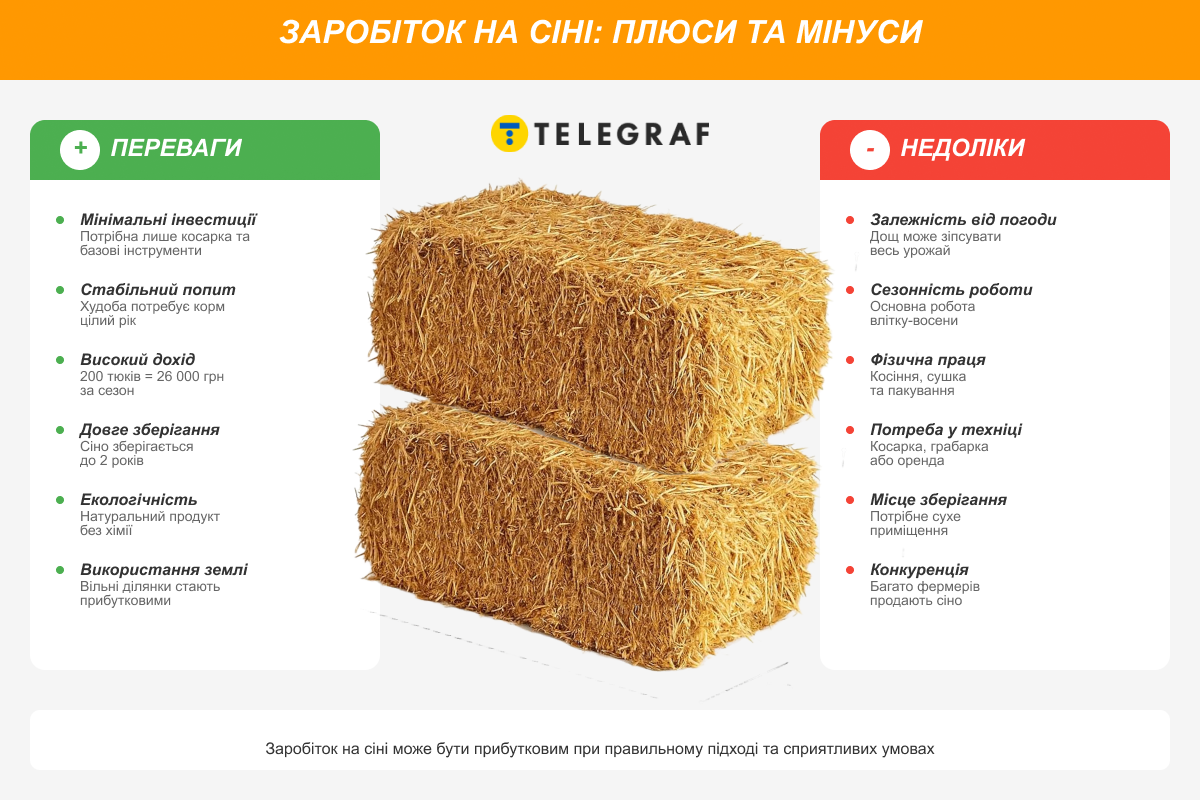 - За даними актуальних оголошень на ринку, один тюк якісного лугового сіна коштує 130 гривень. За 200 тюків з ділянки можна заробити 26 000 грн за сезон.
