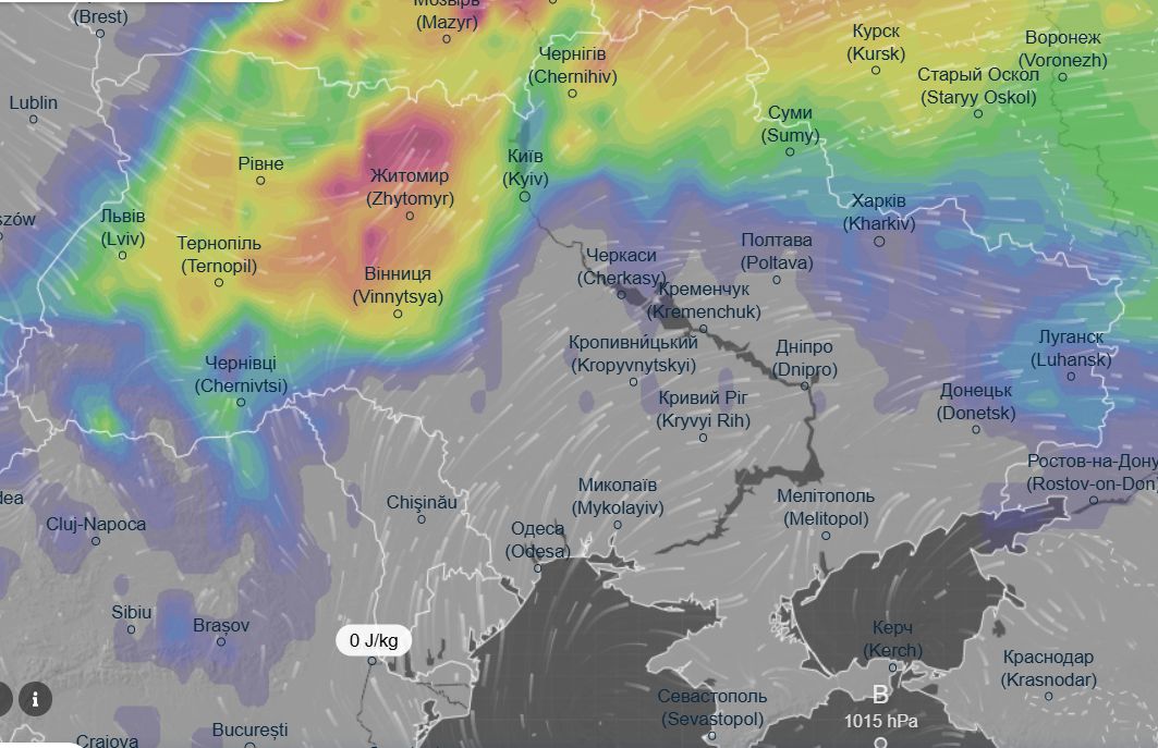 Згідно з даними сервісу, індекс атмосферної нестабільності (CAPE) для цих двох областей може сягати 2300 Дж/кг, що можна інтерпретувати як зливи з грозами. Іноді у таких випадках можливий град і шквальні пориви вітру.