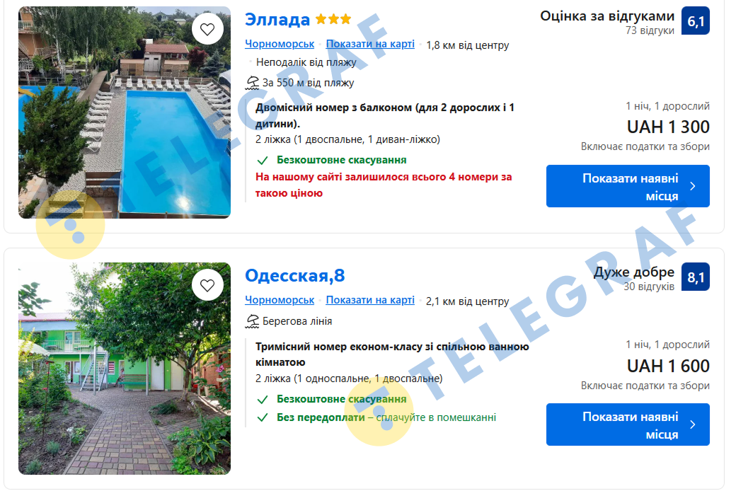 Чорноморськ — це варіант для тих, хто хоче моря без ажіотажу великих курортів. Номери в Чорноморську коштують від 500 грн. За ці гроші пропонують розміщення в гостьовому домі за кілька хвилин пішки до моря. В номері — холодильник та кондиціонер, на спільній території — мангал, кухня тощо.