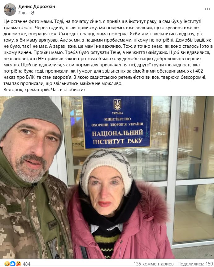 Харківський депутат та військовослужбовець ЗСУ Денис Дорожкін втратив матір через те, що своєчасно не зміг демобілізуватися. За його словами, останнє фото він зробив на початку січня.