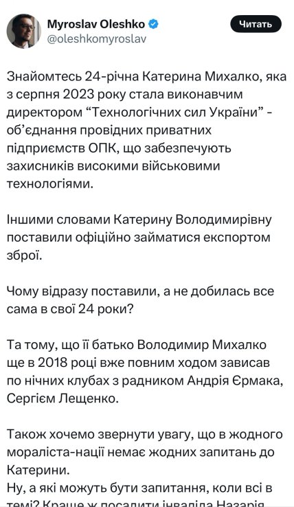У своєму дописі він не лише розвінчує міфи про "недосвідченість" Михалко, а й пояснює системний характер проблеми: