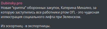 Народний депутат Олександр Дубинський, який перебуває у СІЗО за підозрою у державній зраді, також активно веде свій Telegram-канал, дискредитуючи Україну. Він відкрито атакував Михалко та її прихильників, називаючи це "операцією прикриття корупційних схем". Дубинський зневажливо відгукнувся про захисників Михалко, звів громадську підтримку до "жіночої емоційності" і припустив її участь в "афері на півмільйона доларів" у 17 років, представляючи Михалко як "зручне прикриття каламутних схем".