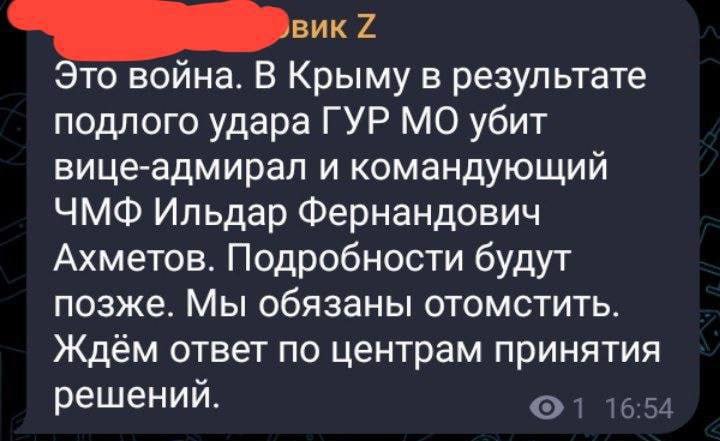 Так звані воєнкори в Telegram заявили, що Ахмерова було вбито "внаслідок підлого удару ГУР МО". Що цікаво, днями повідомляли про масштабні вибухи на півострові.