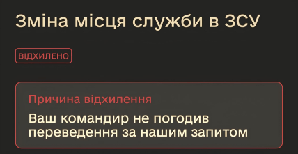 Формально будь-який військовослужбовець має право подати електронний рапорт на переведення. Від листопада 2024 року прослідкувати хід розгляду та дізнатися про результат можна через цифровий сервіс "Армія+".