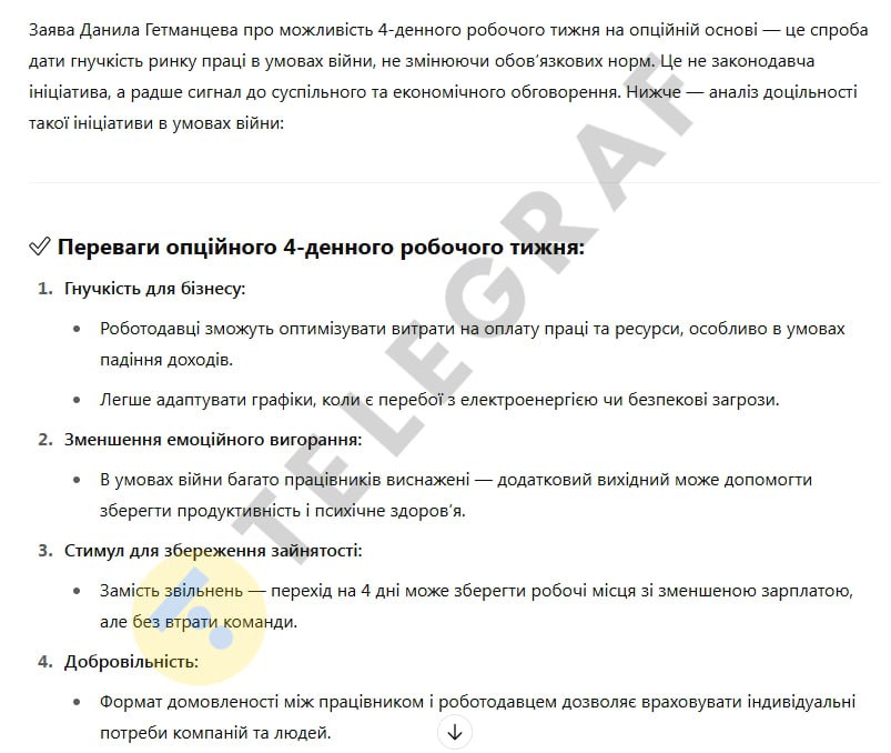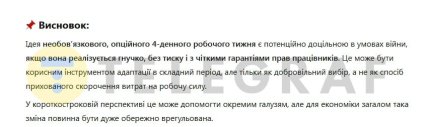 "Я б таке підтримав. На період війни це не можна робити обов’язково, все ж таки роботодавець повинен це з трудовим колективом вирішувати. Але зробити це опціонально і дати таку можливість — щоб роботодавець і працівник могли домовитися про такий режим роботи — я б на це пішов", — сказав він.