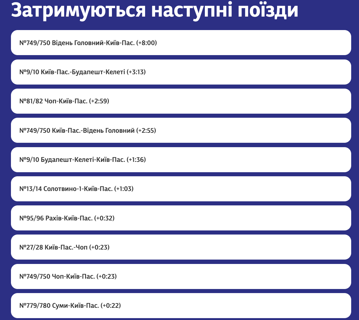Негода вплинула і на рух поїздів "Укрзалізниці", адже щонайменше 20 рейсів затримується. Найбільша затримка в 8 годин поїзда №749/750 Відень Головний-Київ. Ще кілька рейсів затримуються на 2-3 години, але переважна більшість на кілька хвилин.