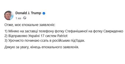 Президент США Дональд Трамп різко змінив свою позицію щодо України та обіцяє надати їй зброї на мільярди доларів, хоч і за гроші НАТО. Ну а оскільки відносини в українських користувачів мережі з американським лідером із самого початку поточного року можна описати терміном "емоційна гойдалка", то й зараз у мережі знову спалахнули бурхливі пристрасті.
