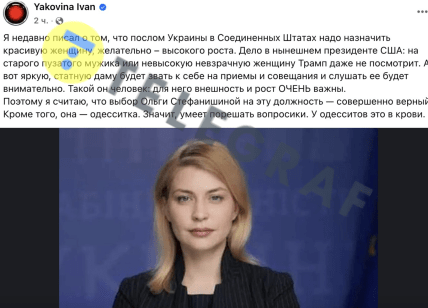 "Я нещодавно писав про те, що послом України у Сполучених Штатах треба призначити гарну жінку, бажано – високого зросту. Справа у нинішньому президенті США: на старого пузатого мужика чи невисоку непоказну жінку Трамп навіть не подивиться", — йдеться у повідомленні.