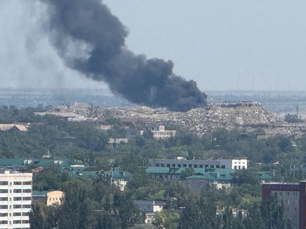 На кадрах видно величезний стовп чорного диму. Російські Telegram-канали пишуть, що причиною пожежі є нібито спалах на сміттєзвалищі, а вогонь підібрався до приватного сектору в районі Кальміуса.