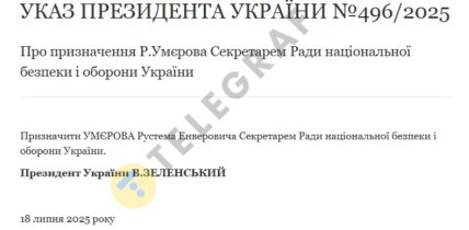 Відповідний указ №496/2025 вранці 18 липня з'явився на сайті глави держави."Призначити УМЄРОВА Рустема Енверовича Секретарем Ради національної безпеки і оборони України", — йдеться у повідомленні.