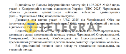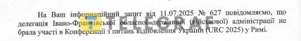 Схожа ситуація і в Івано-Франківській області. Там, як офіційно повідомили "Телеграфу", ані обласна адміністрація, ані її представники взагалі не брали участі в конференції URC-2025.