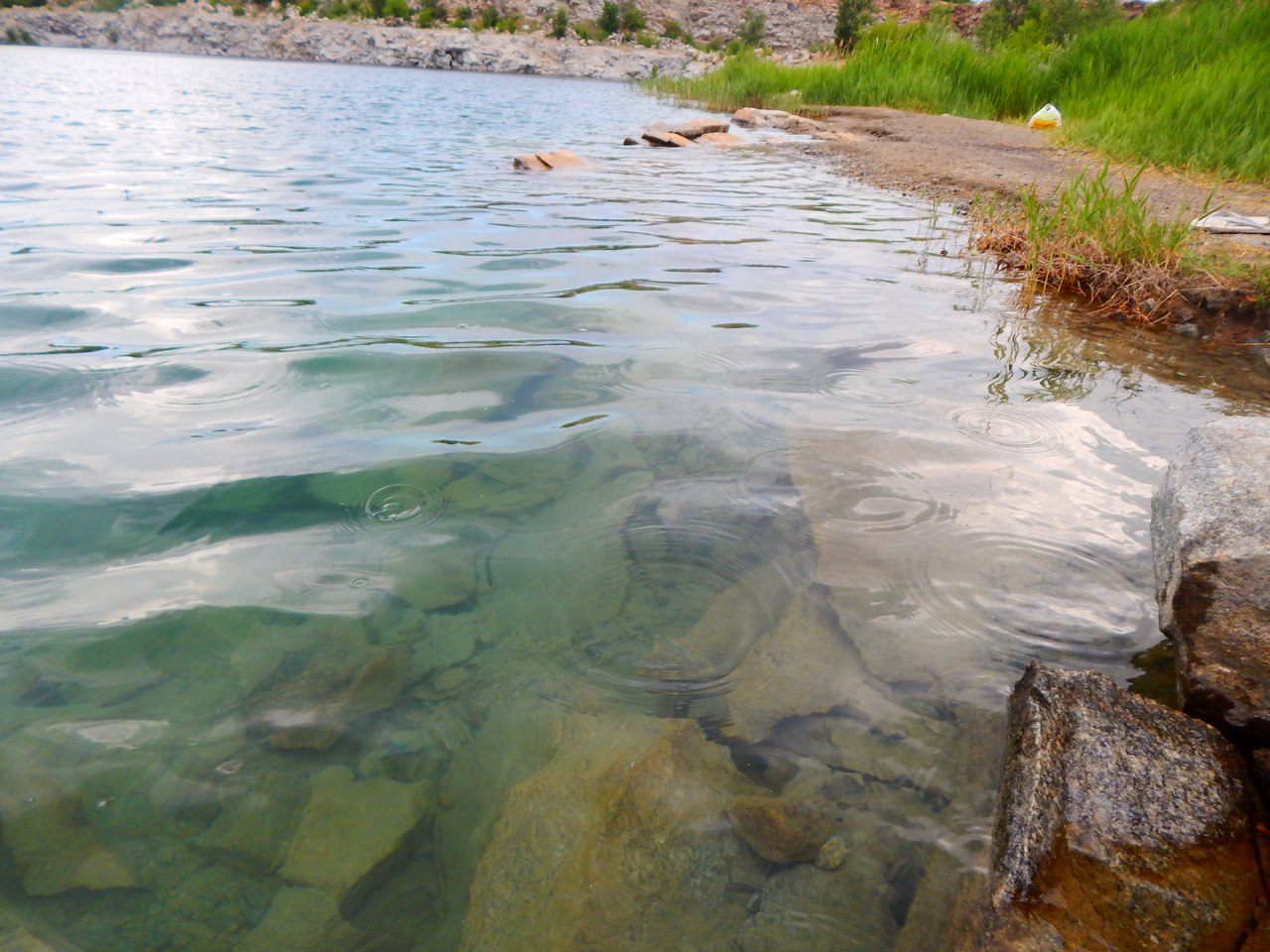 Високі кам'яні обриви глибиною від 6 до 9 метрів оточують насичену блакитну воду, створюючи ефект природного амфітеатру. Особливий колір води пояснюється великою глибиною та гранітним дном, що властиво саме гранітним кар'єрам.