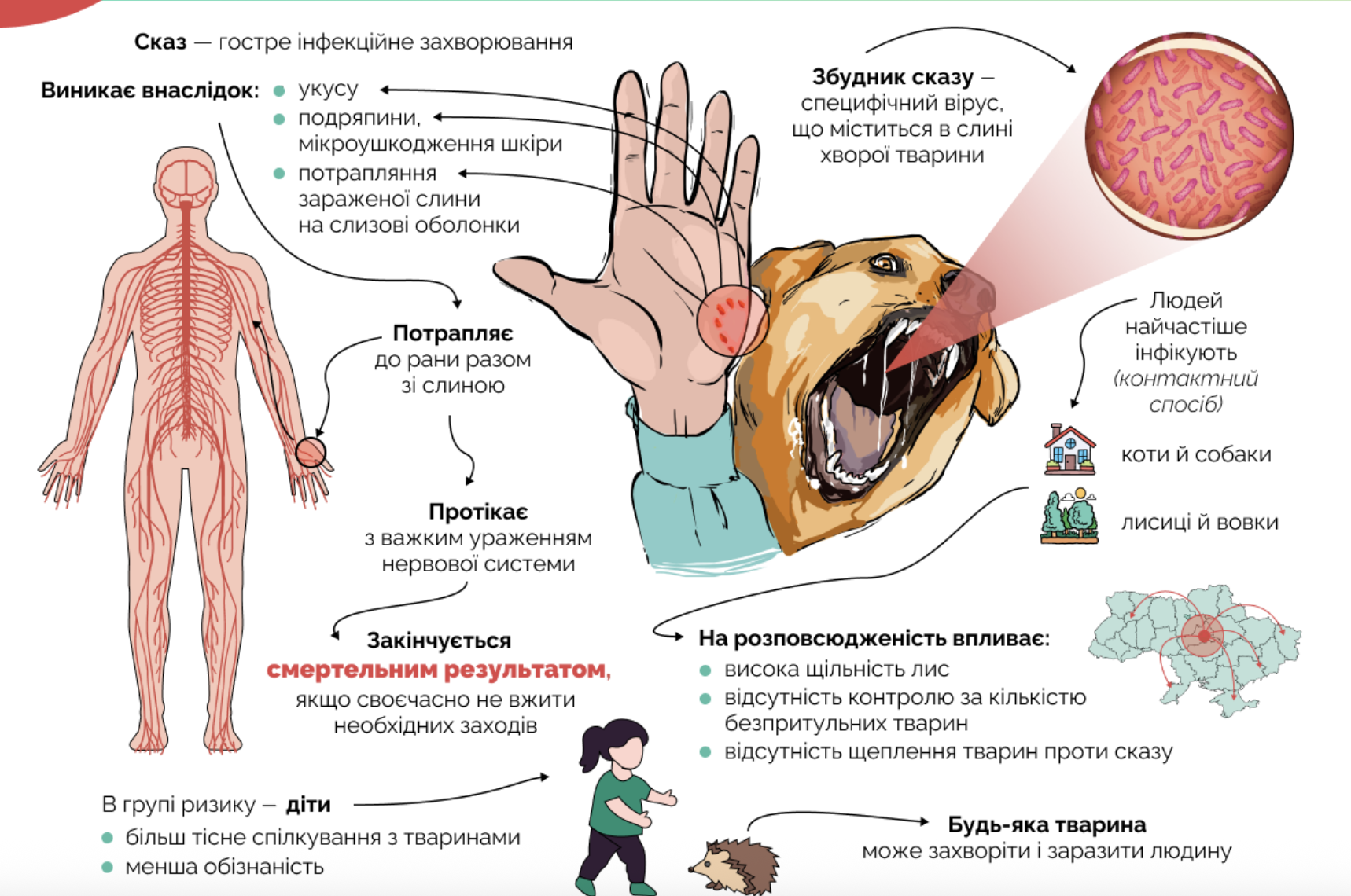 Він додає, що лисиці — природний резервуар для сказу. Тобто до року у них захворювання протікає безсимптомно, а вже після може з'явитись слинотеча, страх світла, води тощо. Але навіть клінічна картина сказу у лисиць досить змазана, не така як у домашніх хижаків. Хвора на сказ лисиця зазвичай живе не більше 7-10 днів після появи перших симптомів.