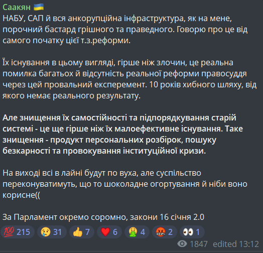 "НАБУ, САП й вся антикорупційна інфраструктура, як на мене, порочний бастард грішного та праведного", — заявив Саакян. За його словами, десятирічне існування цих інституцій не дало очікуваного результату, однак їх знищення через підпорядкування старій системі — ще гірше.