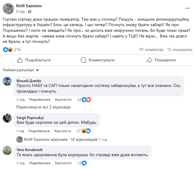 "Гортаю стрічку, доки працює генератор. Там жах у столиці? Пишуть — знищили антикорупційну інфраструктуру в Україні? Блін, це капець. І що тепер? Почнуть знову брати хабарі? Як при Порошенко?" — написав Сазонов.
