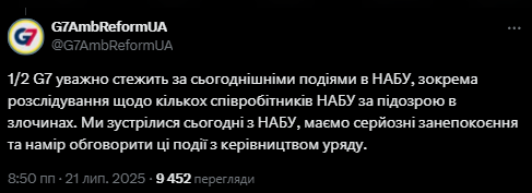 Занепокоєння також висловила Група послів G7. У заяві у X йдеться, що посли уважно стежать за розслідуванням щодо кількох співробітників НАБУ та вже обговорили ситуацію з керівництвом бюро.