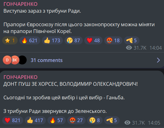 Народний депутат Олексій Гончаренко також розкритикував ухвалення Верховною Радою законопроєкту №12414. У своєму публічному дописі він заявив: