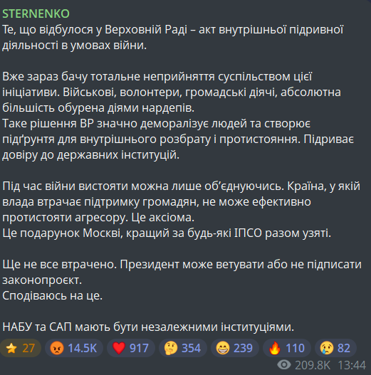 Стерненко закликав президента Зеленського не підписувати або ветувати закон, зазначивши, що "ще не все втрачено". Він підкреслив, що НАБУ та САП мають залишатися незалежними інституціями.