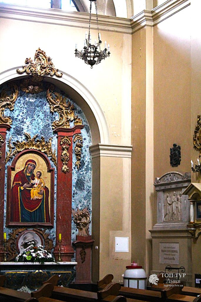 Інтер'єр вражає скульптурною різьбою, витонченими каплицями та глибокими криптами, де поховано чимало представників знаті