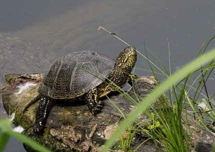 Черепаха болотяна (Emys orbicularis) — єдиний природно поширений в Україні вид прісноводних черепах із родини Emydidae. Її панцир овальної форми, забарвлений від оливково-зеленого до темно-чорного з жовтими цяточками, досягає довжини 12–20 см. Характерною особливістю є гнучкий пластрон, що забезпечує адаптацію до пересування у воді та на суші. Цей вид надає перевагу стоячим або малопроточним водоймам зі стійкою надводною і підводною рослинністю, де відбувається його кормова діяльність.