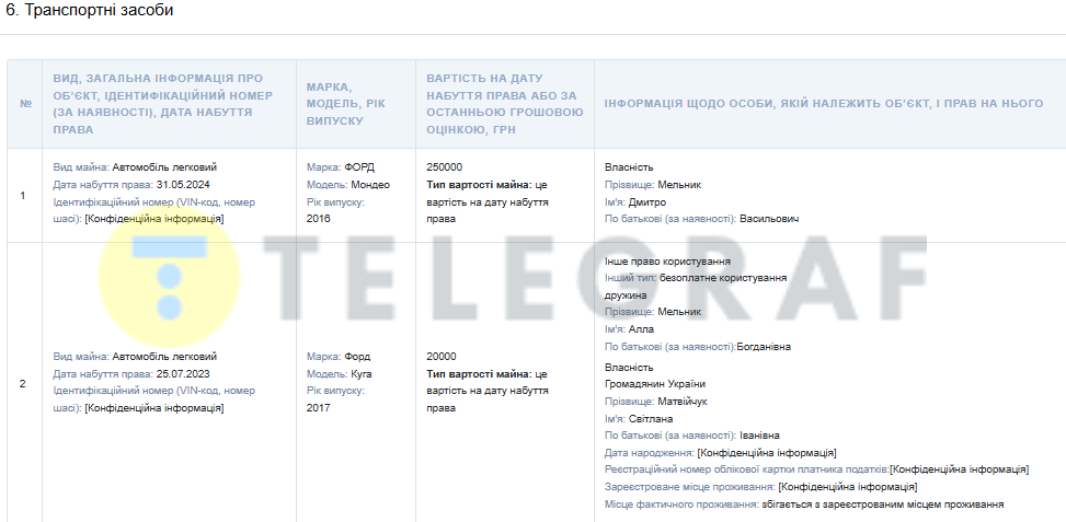 У розділі нерухомості зазначено, що Дмитро Мельник має з 2024 року квартиру в місті Дубно Рівненської області. Тим часом його дружині Аллі Мельник належать дві земельні ділянки на Рівненщині, ще одну вона бере в оренду. Також орендує офіс у Демидівці.