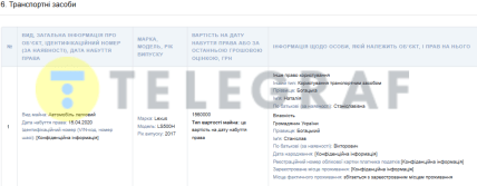 У графі транспортних засобів зазначено, що суддя володіє автомобілем Lexus LS500H 2017 року випуску, який вона придбала за 1560000 гривень у 2020 році.