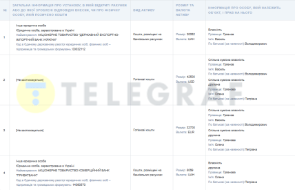 На банківських рахунках Василь Грязнов зберігає 30 052 гривні, а його дружина — 8 069 гривень. У спільній власності подружжя має 42 500 доларів і 32 700 євро.