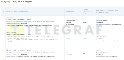 Зарплата судді за минулий рік становила 1 363 170 гривень. Ще 141 660 гривень він одержав у вигляді пенсії.