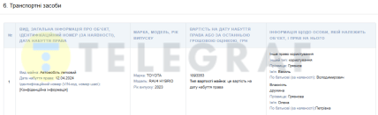 У графі транспортних засобів зазначено, що дружина судді Олена Грязнова 2024-го придбала автомобіль Toyota RAV4 Hybrid 2023 року за 1 893 353 гривень.