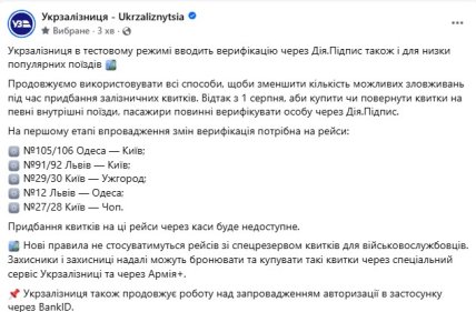 Компанія нагадала про інструменти контролю, які діють понад два роки. Для купівлі квитків на популярні міжнародні рейси потрібна верифікація через Дію. За словами УЗ, сотні пасажирів із квитками на чуже ім'я вже не допустили до поїздів.