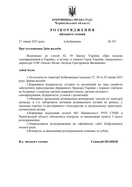 В Бобровицькій громаді Чернігівської області оголосили триденну жалобу через смерть колишнього народного депутата Верховної Ради України I скликання, Героя України та відомого аграрія Леоніда Яковишина. Він помер 26 липня 2025 року на 87-му році життя.