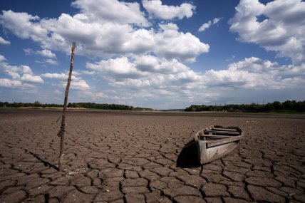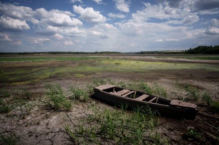 Ханженківське водосховище на Кринках — головне джерело питної води для Донецька і не тільки. На фото видно, що водойма пересохла настільки сильно, що відкрилось її дно, яке усіяли тріщини. Ба більше, залишились прив'язані човни, а подекуди навіть видно скелети риби та мушлі молюсків.