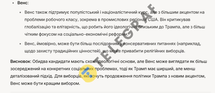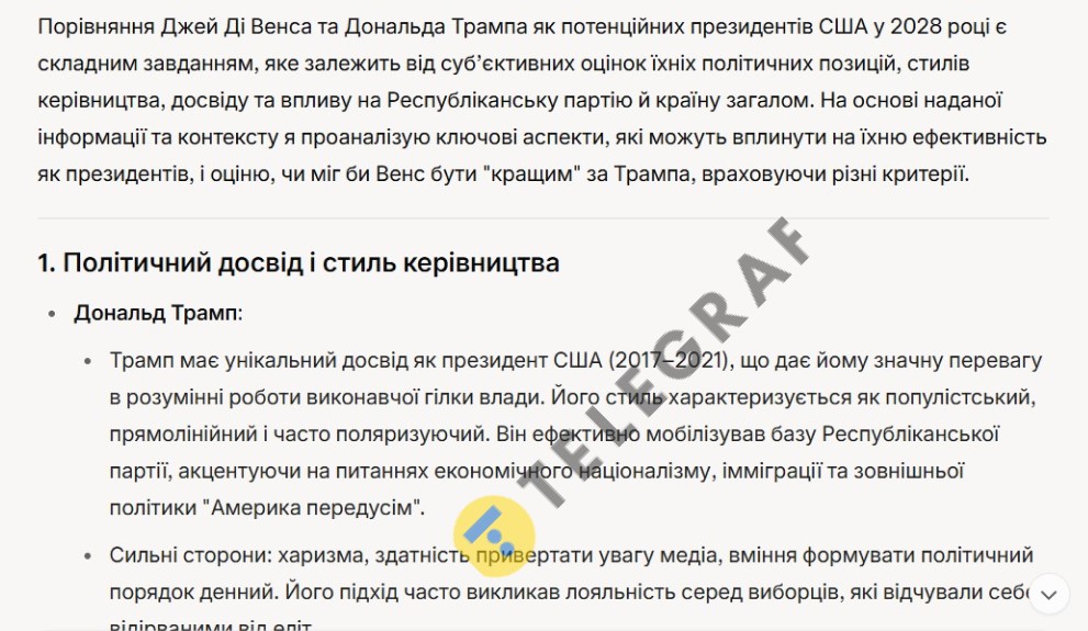 На фоні цих заяв "Телеграф" звернувся до штучного інтелекту з питанням про порівняння Венса та Трампа як потенційних президентів.