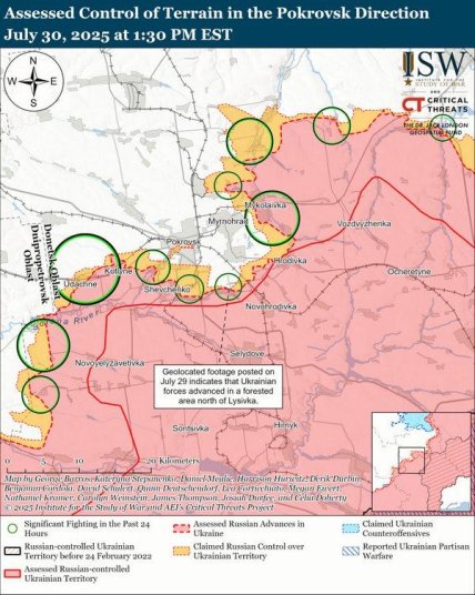 Інститут вивчення війни повідомив, що 30 липня Збройні сили України витіснили росіян під Покровськом. Геолокаційні відео показують, що українські бійці просунулися в північній частині села Лисівка. Також наші захисники утримують позиції у Володимирівці та відбили ворожі атаки біля Шахового.