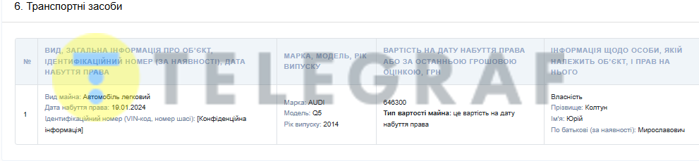 У графі транспортних засобів наголошується, що у 2024 році Колтун придбав автомобіль Audi Q5 2014 року випуску за 646 300 гривень.