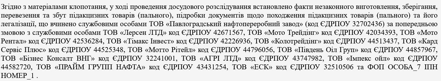 До речі, ще два роки тому контрафакт вироблявся не лише на міні-НПЗ, а і на великих переробних заводах. Так, одним із головних постачальників фальсифікату тривалий час був "Павлоградський нафтопереробний завод". Згадки про це можна знайти, ще починаючи з 2016 року. Йдеться про дві окремі юрособи: Державне підприємство "Павлоградський хімічний завод" та ТОВ "Павлоградський нафтопереробний завод", яке за документами орендувало в ДП начебто всього 19 кв. м площі. Та насправді використовувало значні потужності держпідприємства для виробництва контрафакту.