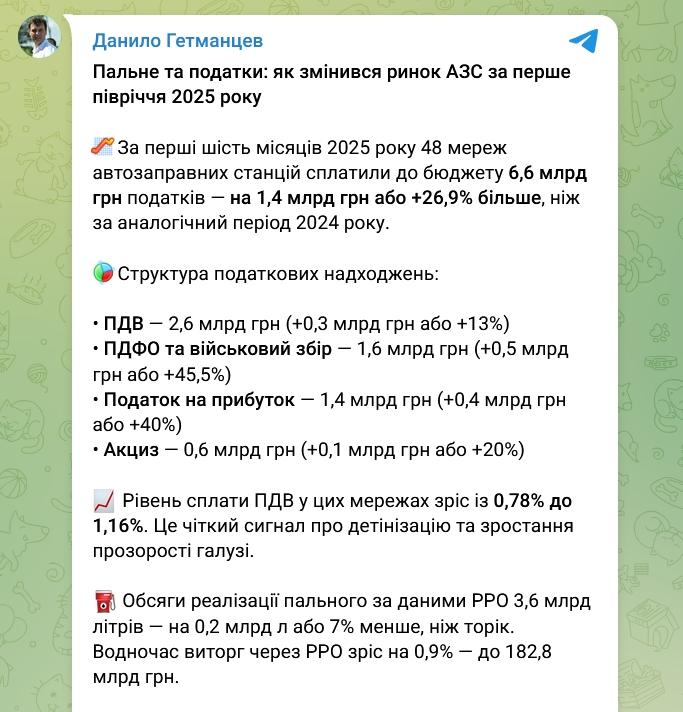 Якщо раніше значна частина заправок бідкалася, що вона збиткова, чи на грані збитковості, то в останні місяці намітилася явна тенденція до покращення – багато АЗС, особливо мережевих, "несподівано" стали прибутковими. За даними Данила Гетманцева, за перші шість місяців 2025 року 48 мереж автозаправних станцій сплатили до бюджету 6,6 млрд грн податків — на 1,4 млрд грн, або +26,9% більше, ніж за аналогічний період 2024 року. І це на фоні зменшення на 7% загального обсягу реалізації.
