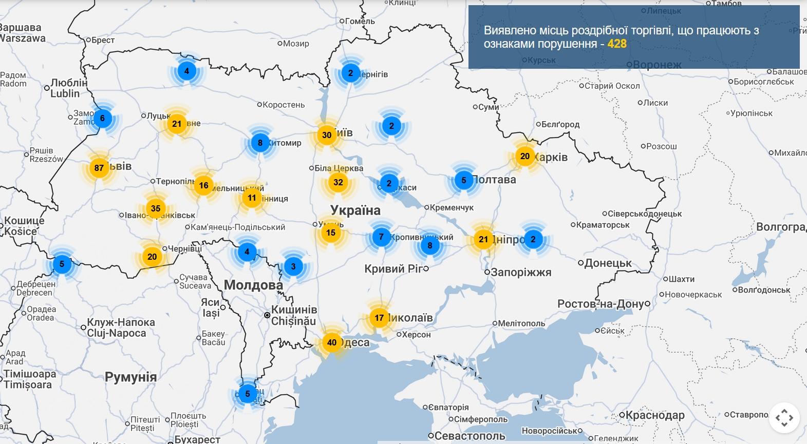 На цій карті зафіксовано 428 місць роздрібної торгівлі, що працюють з ознаками порушення (у тому числі – продають фальсифіковане пальне), хоча у реальності їх, звичайно ж, більше.