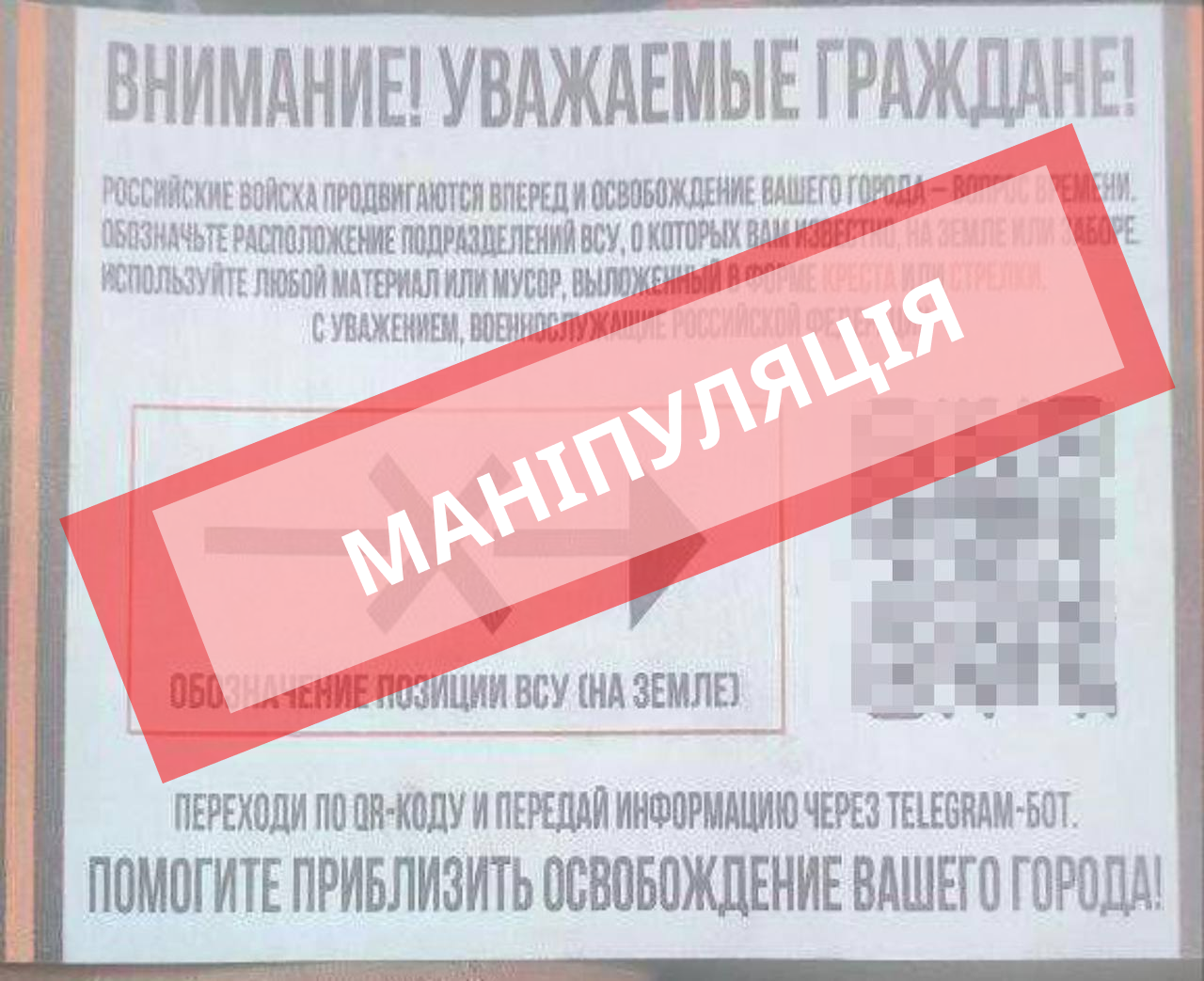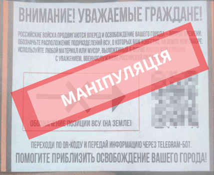 На розкиданих агресором листівках кричущими заголовками нібито повідомляють про наближення російських військ і "неминуче визволення міста". Окупанти цинічно закликають мешканців позначати розташування підрозділів ЗСУ на землі або парканах, використовуючи будь-який матеріал у формі хреста чи стрілки.